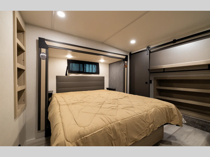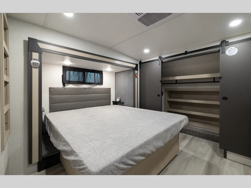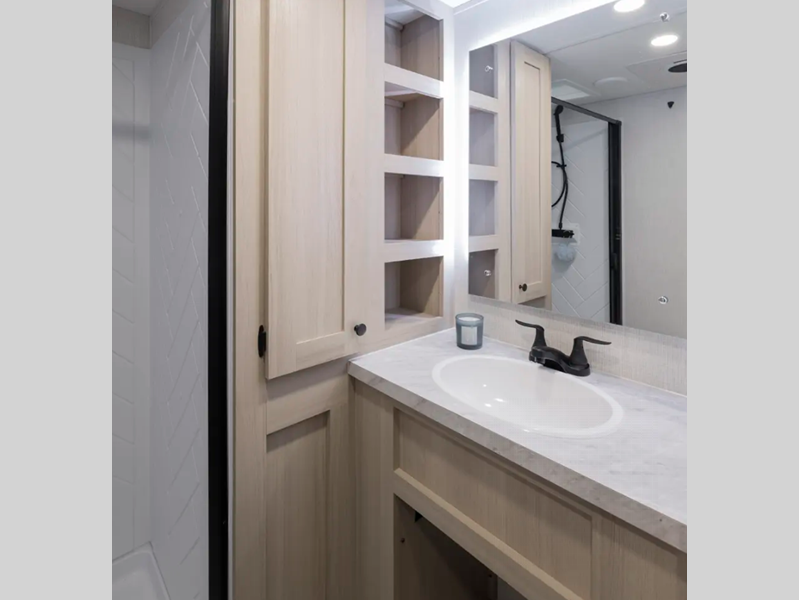 Each model is constructed with a vacuum bonded, welded aluminum structure, along with a PVC roof membrane, residential fiberglass insulation, and many durable construction materials. You will love the oversized opening windows in the living room, the walk-in shower in the bath, and the residential backsplash in the kitchen. The Climate Package helps extend your camping season and the Expedition Package includes many hassle-free amenities such as an outdoor shower, motion lighting throughout, and 4-point auto leveling!