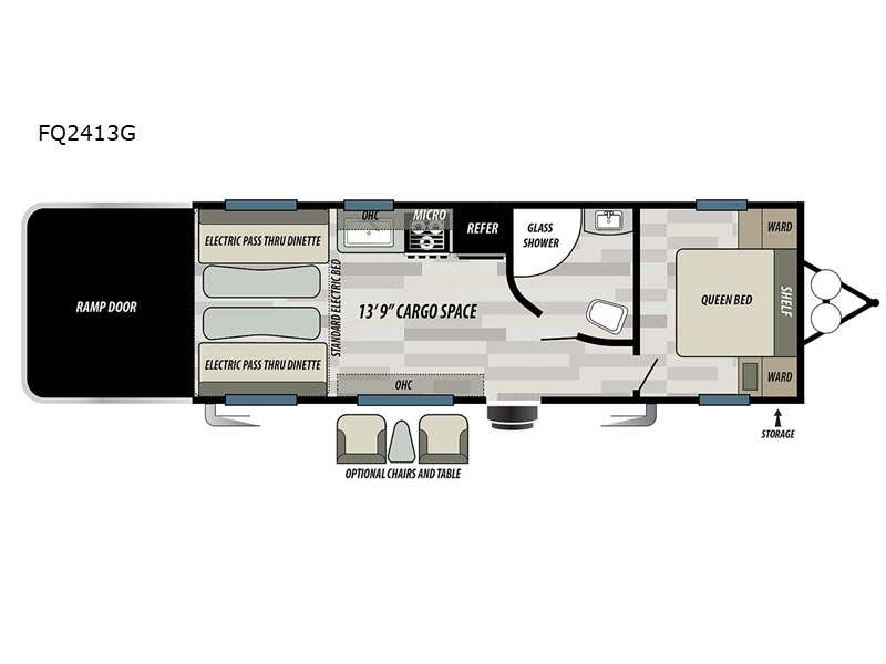 Head to your favorite camping spot in this toy hauler with the whole gang! You will enjoy your privacy with the front private bedroom that has a queen bed with wardrobes on either side to keep your clothes looking nice. Start each morning feeling clean and fresh after showering in the full bathroom with the radius glass shower. The rear electric pass-through dinette is great for not only enjoying a meal or playing a card game, but also for transforming into an extra sleeping space in addition to the electric bed above it. You can also add the optional chairs and table, and it is built with a fiberglass exterior!